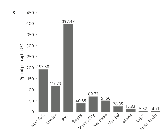 O gasto em relação ao PIB também é desigual: na média, as cidades do mundo rico gastaram 0,22% de sua riqueza em 2012/2015 em resiliência, enquanto no mundo em desenvolvimento esse gasto foi de 0,14% (Adis mais uma vez) a 0,16% (São Paulo). A exceção foi Pequim, que teve o maior gasto por PIB das dez cidades analisadas, 0,33% – algo que os autores atribuem ao dirigismo do governo central, que em 2007 baixou uma diretiva para incluir adaptação como política pública a cargo das prefeituras. O investimento per capita mostrou outro abismo: Paris gastou mais por habitante em adaptação do que todas as outras – duas vezes mais do que Nova York, oito vezes mais que São Paulo e 99 vezes mais que a pobre Adis.