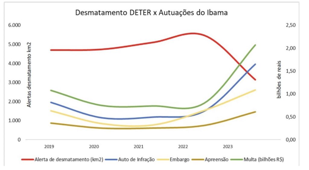 A reversão da curva de desmatamento é resultado da retomada das ações de comando e controle, que integram o novo Plano de Prevenção de Combate ao Desmatamento na Amazônia (PPCDAm). Houve aumento de 173% nos autos de infração aplicados pelo Ibama na Amazônia, na comparação com a média anual dos últimos quatro anos. As multas subiram 147% e os embargos, 123%. Além disso, foi registrado aumento de 107% nas apreensões de bens em áreas de crime ambiental realizadas pelo Ibama. Entre os bens apreendidos, estão 3 mil cabeças de gado. O Ibama bloqueou, ainda, 2 milhões de metros cúbicos em créditos virtuais de madeira ilegal.