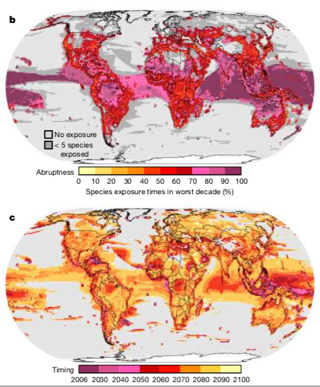 Regiões como a Amazônia, o Sahel, o noroeste da Austrália e o Sudeste Asiático poderão ter 90% de suas comunidades de animais empurradas para além do limite de temperatura no qual elas evoluíram por milhares de anos. Pior ainda: em muitos casos a virada será abrupta, ou seja, ocorrerá em intervalos de tempo muito curtos, de uma década ou menos. É o caso da Amazônia, onde a maior parte das espécies entra na zona quente por volta de 2050.