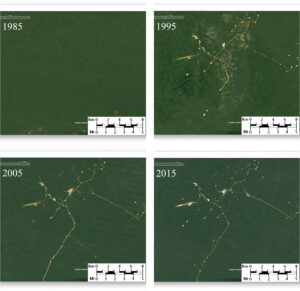 A pesquisa avaliou 3.101 poços em terra em 55 países, incluindo o Brasil, e de 396 empresas. A imagem abaixo mostra o desmatamento próximo a poços perfurados na Bacia Amazônica Ocidental entre 1985 e 2015.