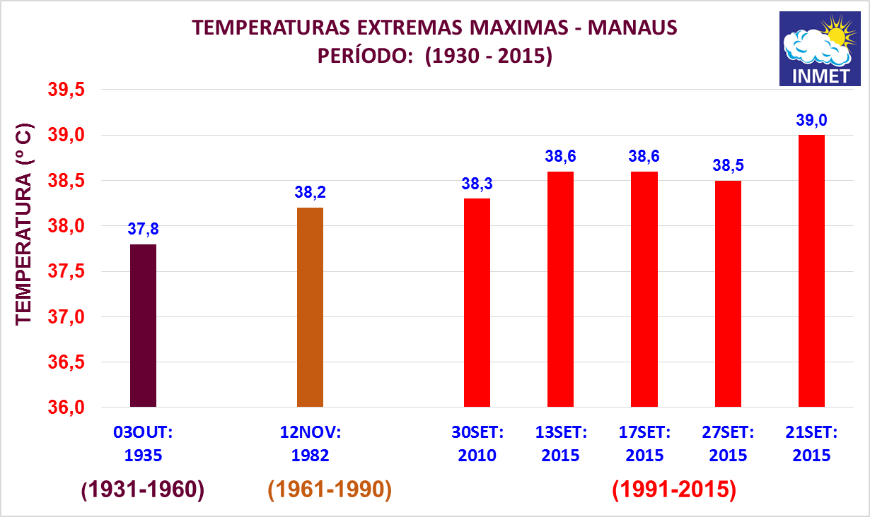 - Manaus: 38,2oC (1982), 38,3oC (2010), 38,6oC (2015), 39oC (2015)