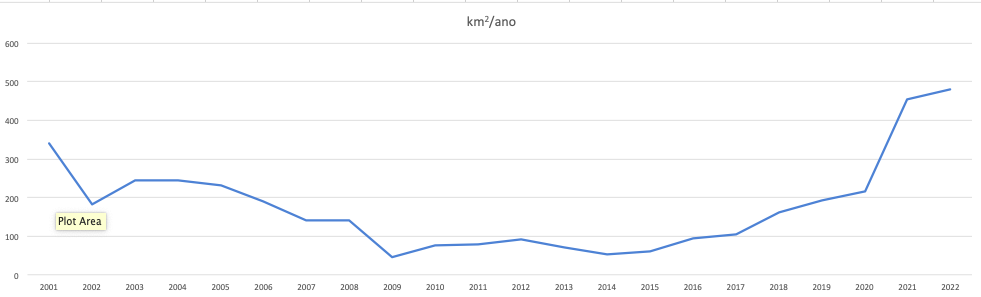 Dados coligidos pelo Inpe a pedido do Observatório do Clima mostram que a devastação numa faixa de 50 quilômetros no entorno da rodovia entrou em tendência de alta após 2014, acelerou após 2017 e explodiu entre 2020 e 2021: de 215 quilômetros quadrados, a área desmatada saltou para 453 quilômetros quadrados, uma alta de 110% em apenas um ano – a maior da série histórica iniciada em 2001. Em 2022 o desmate cresceu mais 6%.