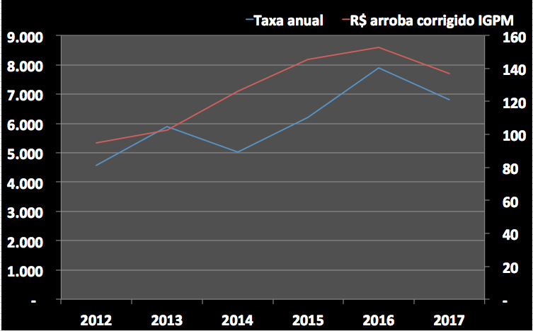 A desaceleração da taxa se deveu em grande parte à retomada da fiscalização do Ibama, que havia recuado em 2016 por falta de dinheiro e voltou graças a recursos do Fundo Amazônia. Mas em parte ela também pode ser atribuída à queda de 10% no preço do boi gordo, que tem uma correlação positiva com a taxa de desmatamento, como mostra este gráfico do Imazon: