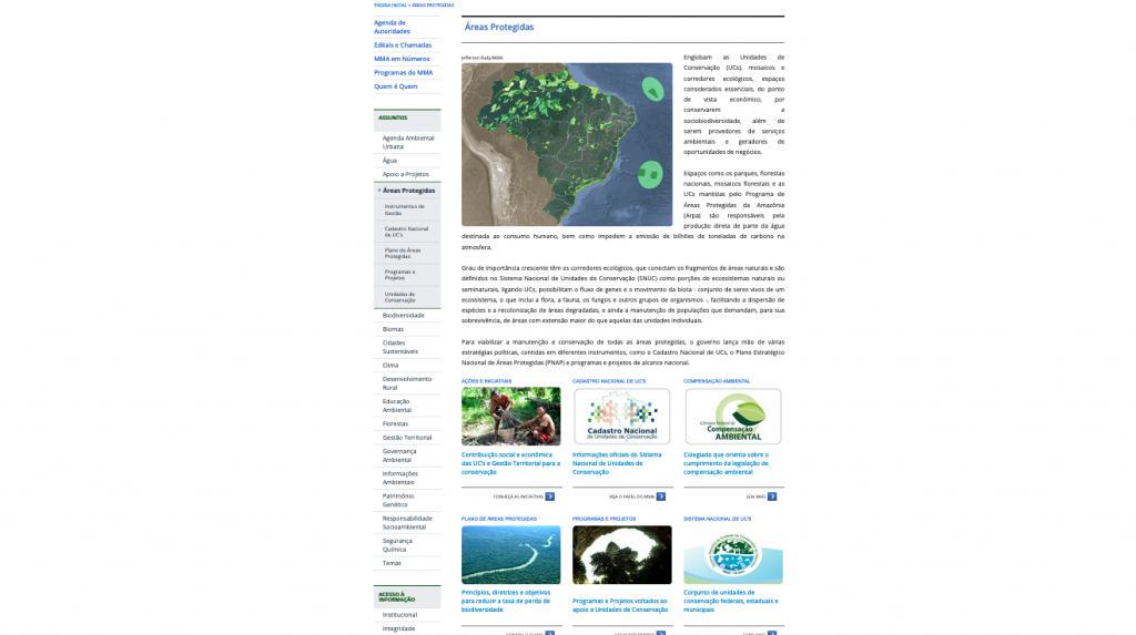 O “processo de migração”, porém, não parece ter afetado os programas da atual gestão do MMA. Quem for ao site novo na área de “áreas protegidas e ecoturismo” encontrará links apenas para duas iniciativas do atual ministro: a concessão de parques nacionais (que começou no governo Dilma, mas ganhou ênfase no atual) e o Adote 1 Parque, que nem sequer existe. No site antigo havia links para sete iniciativas, entre elas o cadastro nacional de UCs, as diretrizes para reduzir a perda de biodiversidade e a câmara de compensação ambiental.