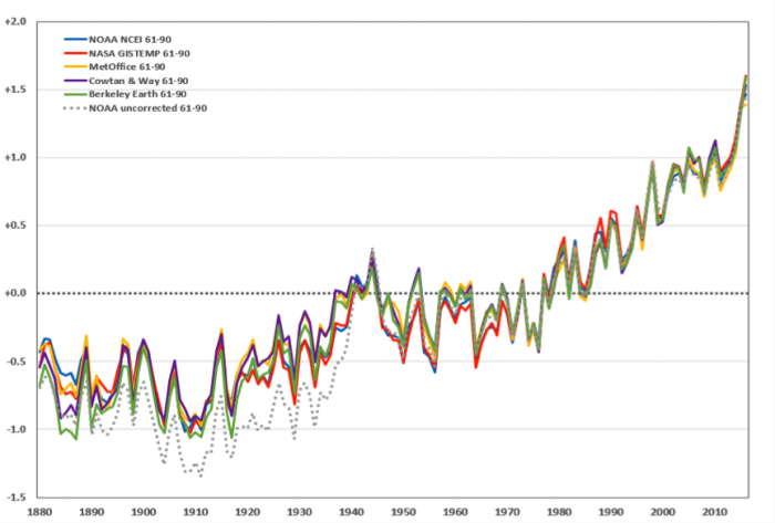 Embora as metodologias tenham diferenças significativas, todos concordam que 2016 bateu o recorde anterior, de 2015, que por sua vez havia batido o recorde de 2014. É a primeira vez desde o final da década de 1930 que o mundo vê três anos seguidos de aquecimento. A maior parte do aquecimento ocorreu nos últimos 35 anos, com 16 dos 17 anos mais quentes da história no século 21.