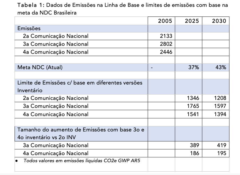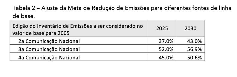 As tabelas abaixo mostram como as emissões brasileiras variam de acordo com a linha de base adotada (Tabela 1) e qual teria de ser o grau de ajuste para pelo menos empatar com a NDC de 2015 (Tabela 2).