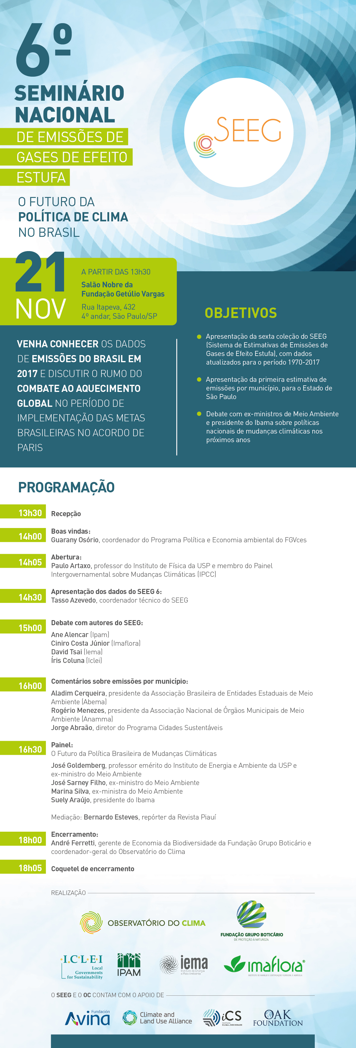 O Observatório do Clima realizará nesta quarta-feira (21) na FGV, em São Paulo, o seminário de lançamento dos dados de emissões de gases de efeito estufa do Brasil do ano de 2017. É a sexta edição do SEEG (Sistema de Estimativas de Emissões de Gases de Efeito Estufa), que trará dados atualizados da série que começa em 1970.