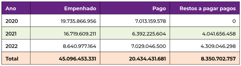 O orçamento secreto movimentou entre 2020 e outubro de 2022 R$ 45 bilhões de empenhos e R$ 28 bilhões de pagamentos, considerando compromissos assumidos e pagos em cada ano somados aos pagamentos de valores empenhados desde 2020, os chamados “restos a pagar pagos”.