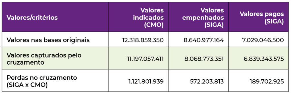 No cruzamento que resulta, assim, da junção de duas bases, foram identificadas perda de dados/valores: i) de R$ 1,1 bilhões, em relação ao que foi indicado na lista da CMO; ii) de R$ 572 milhões de empenhos e R$ 129 milhões de pagamentos em relação aos valores da base de execução utilizada (Siga Brasil). As perdas de valores em função do cruzamento são registradas na tabela 2.