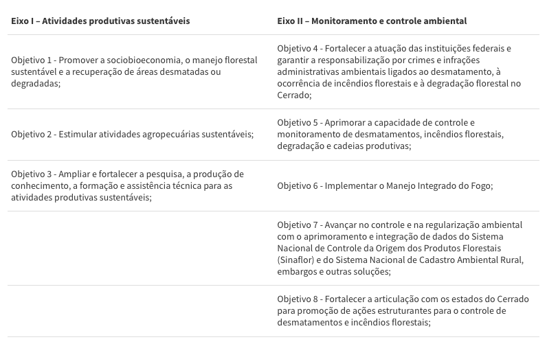 A 4ª fase do PPCerrado tem quatro eixos e 12 objetivos. Confira abaixo: