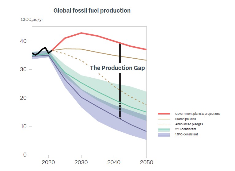 Planos e projeções de produção de fósseis ultrapassam em muito as metas climáticas. (Fonte: PGR 2023)