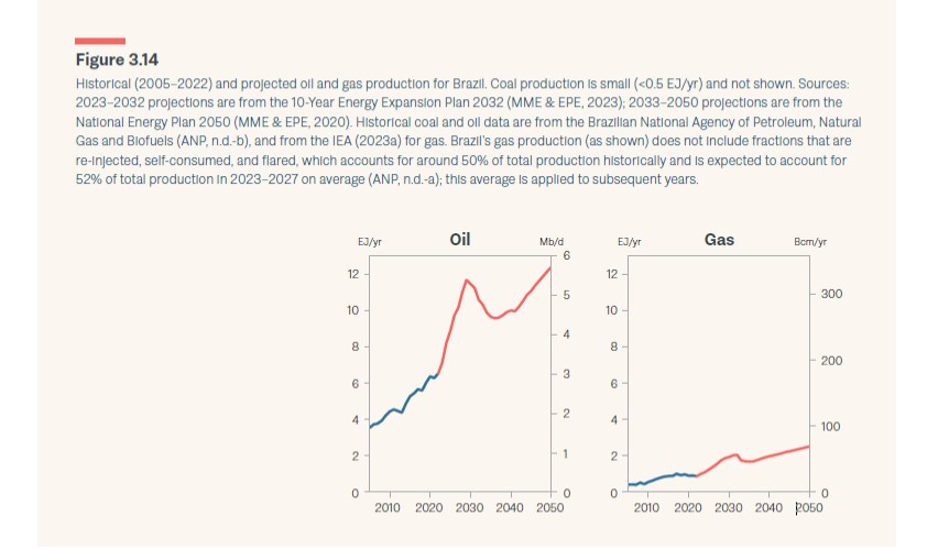 Ao analisar a visão do governo brasileiro sobre a produção fóssil, o texto destaca que o governo Lula continua a apostar na abertura de novas fronteiras de petróleo como caminho para o desenvolvimento econômico e regional. Ao mesmo tempo em que anuncia a intenção de tornar-se neutro em carbono em 2050, os planos de expansão energética do país para os próximos dez anos (2023-2032) e também para 2050 indicam aumento na participação de petróleo e gás no setor.