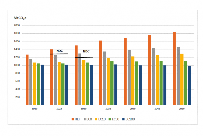 Gráfico mostra projeções de emissão do Brasil no cenário “de referência” (barra laranja) e nos diversos cenários de baixo carbono, sem precificação (cinza) e com preços que vão de US$ 10 a US$ 100 a tonelada. A barra horizontal em 2025 e 2030 indica o limite da NDC.
