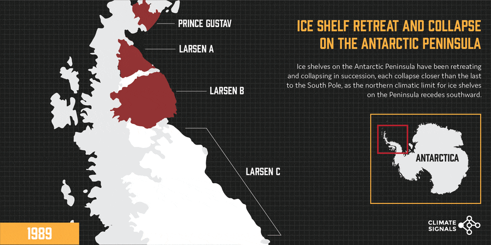Essa previsão foi feita pelo glaciologista americano John Mercer em 1978. E encontrou sua confirmação justamente nas plataformas de gelo Larsen. Em 1978 elas eram quatro. Hoje restam apenas duas.
