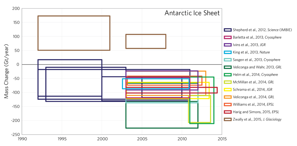Que não haja dúvida aqui: existe perda de gelo no continente antártico, muito bem documentada por satélites da Nasa e da Agência Espacial Europeia. Foi a Nasa quem mostrou o rompimento em tempo real de plataformas de gelo na Península Antártica. E foi a Nasa quem revelou, em 1998, que as geleiras do oeste antártico estavam em franco derretimento. No período de 2002 a 2011, a perda de gelo foi de 147 bilhões de toneladas por ano, segundo o IPCC, o que teria elevado o nível do mar em 0,27 milímetro por ano. Quase todo esse gelo vem do oeste antártico. Um estudo recente sugere que o colapso das geleiras do oeste antártico é irreversível e fará o mar subir 3,3 metros na escala de séculos.