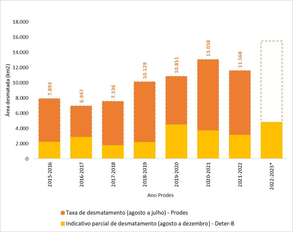Como a taxa de desmatamento na Amazônia é medida sempre de agosto de um ano a julho do ano seguinte, a destruição será herdada pelo presidente Luiz Inácio Lula da Silva na taxa oficial de 2023.