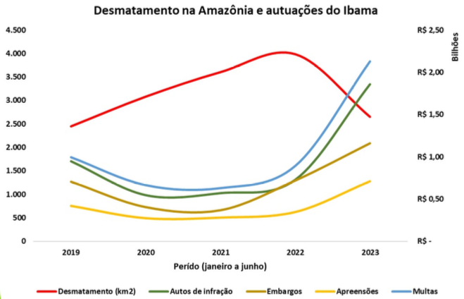 A retomada da governança ambiental se insere na nova fase do PPCDAm, o Plano de Prevenção e Controle do Desmatamento na Amazônia. Principal responsável pela queda na velocidade da destruição da floresta, o plano foi enterrado por Bolsonaro e recriado por Lula. Foi relançado no dia 5 de junho. Nas ações de comando e controle, já começa a produzir resultados. No primeiro semestre de 2023, houve aumento de 166% nos autos de infração, de 111% nos embargos (a proibição de utilização de áreas desmatadas ilegalmente) e de 167% nas multas, na comparação com a média para o primeiro semestre nos quatro anos anteriores. Além disso, o equivalente a 80 mil caminhões (1,6 milhão de m3) em créditos irregulares de madeira foram bloqueados pelo Ibama. O órgão também retomou os embargos remotos, iniciados no governo Temer. Até agora, 206 mil hectares já foram embargados dessa forma.