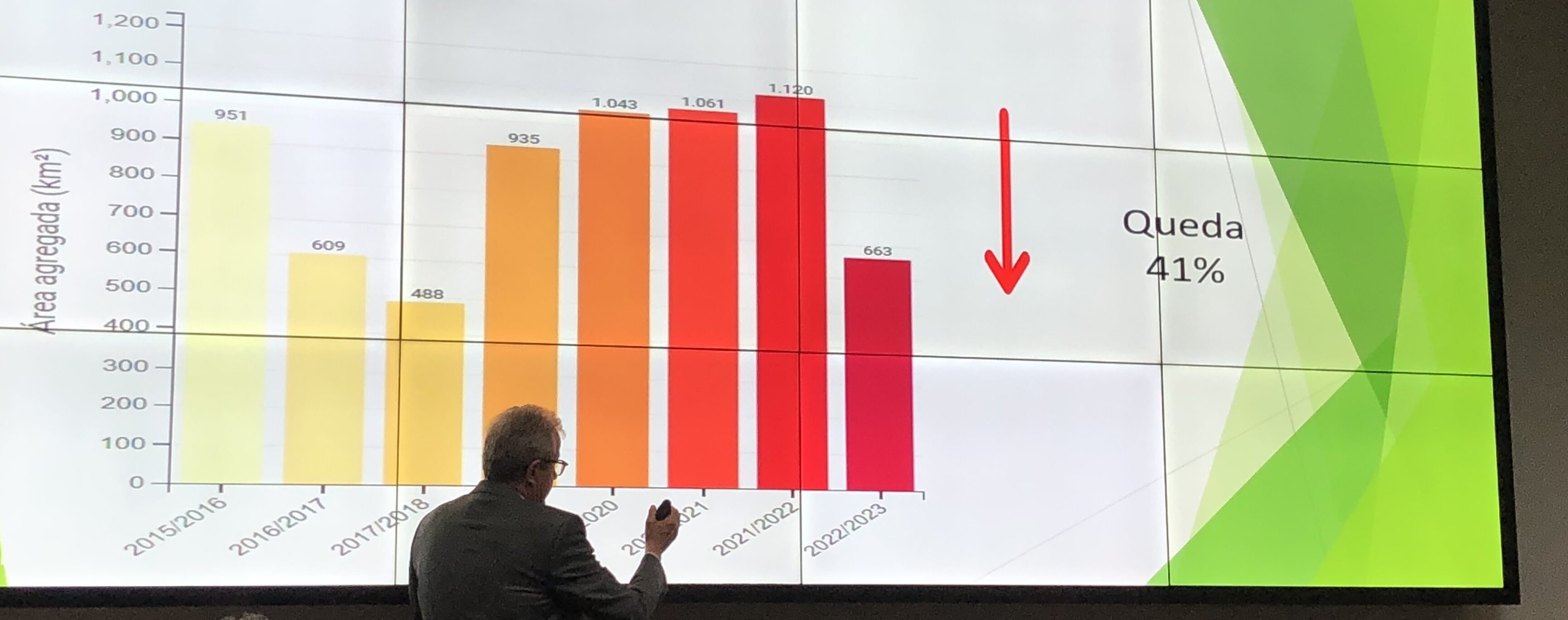 Junho é um mês importante para medir tendências de desmatamento porque é o início da estação seca, quando a maior parte da Amazônia fica livre de nuvens e os satélites ópticos do Deter podem dar um diagnóstico mais próximo da realidade. No mês passado, a área de alertas foi de 663 km2, contra 1.120 em junho de 2022. É a primeira vez desde 2019 que os alertas do Deter num mês de seca ficam abaixo de 1.000 km2, patamar mantido no governo Bolsonaro.