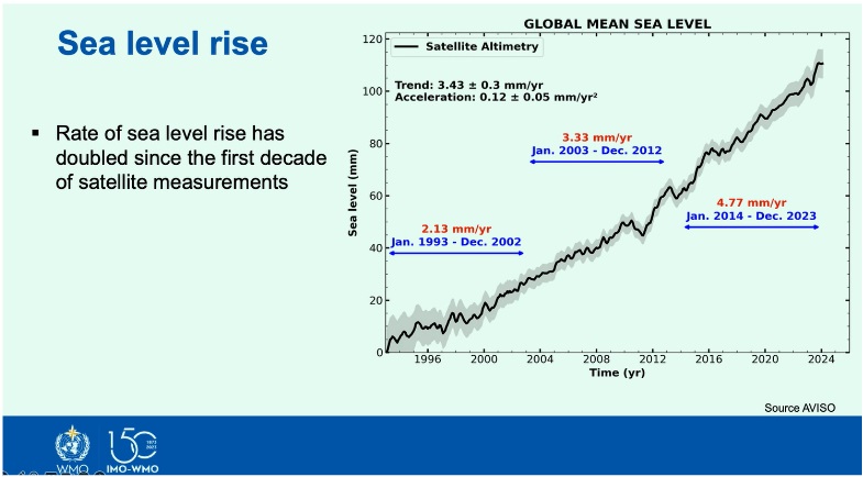 O derretimento do gelo continental aumenta diretamente o nível do mar, enquanto a perda das placas de gelo marinho muda a configuração dos oceanos e os torna mais suscetíveis à absorção de calor. Como mostra a figura abaixo, o indicador de aumento do nível do mar era de 2,13 milímetros ao ano na década de 1993 a 2022. No período de 2014 a 2023, quase dobrou, atingindo os 4,77 mm/ano.