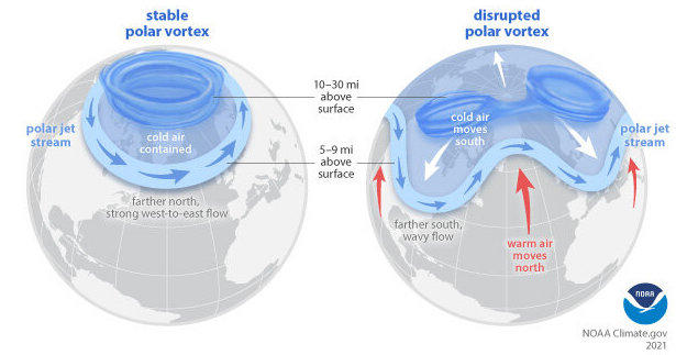 A imagem mostra o vórtice polar estável, à esquerda, e perturbado, à direita, quando o ar frio se move para o sul (Fonte: Noaa)