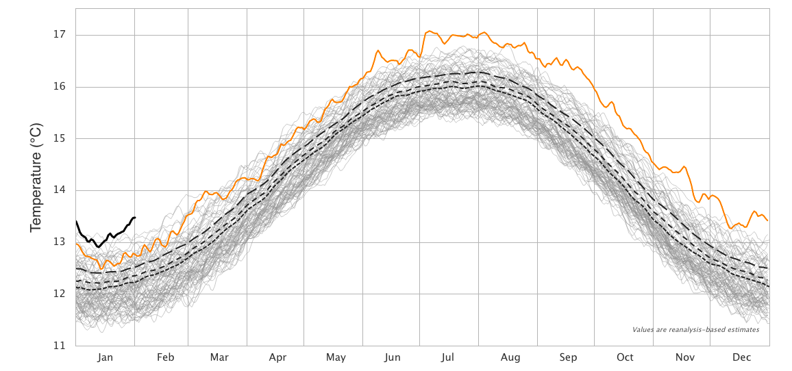 Em comparação com a era pré-industrial (1850-1900), os primeiros 31 dias do ano foram 1,66°C mais quentes. Além disso, a temperatura média global nos últimos doze meses, de fevereiro de 2023 a janeiro de 2024, é a mais alta já registrada. Foi 0,64°C acima da média de 1991-2020 e 1,52°C superior à média de 1850-1900. Na publicação anterior o Copernicus já havia sinalizado que o período de 12 meses poderia ultrapassar 1,5°C, limite de temperatura proposto pelo Acordo de Paris. Pelo menos uma base de dados, a do Berkeley Earth, já mostrou que 2023 ultrapassou o limite de 1,5°C.
