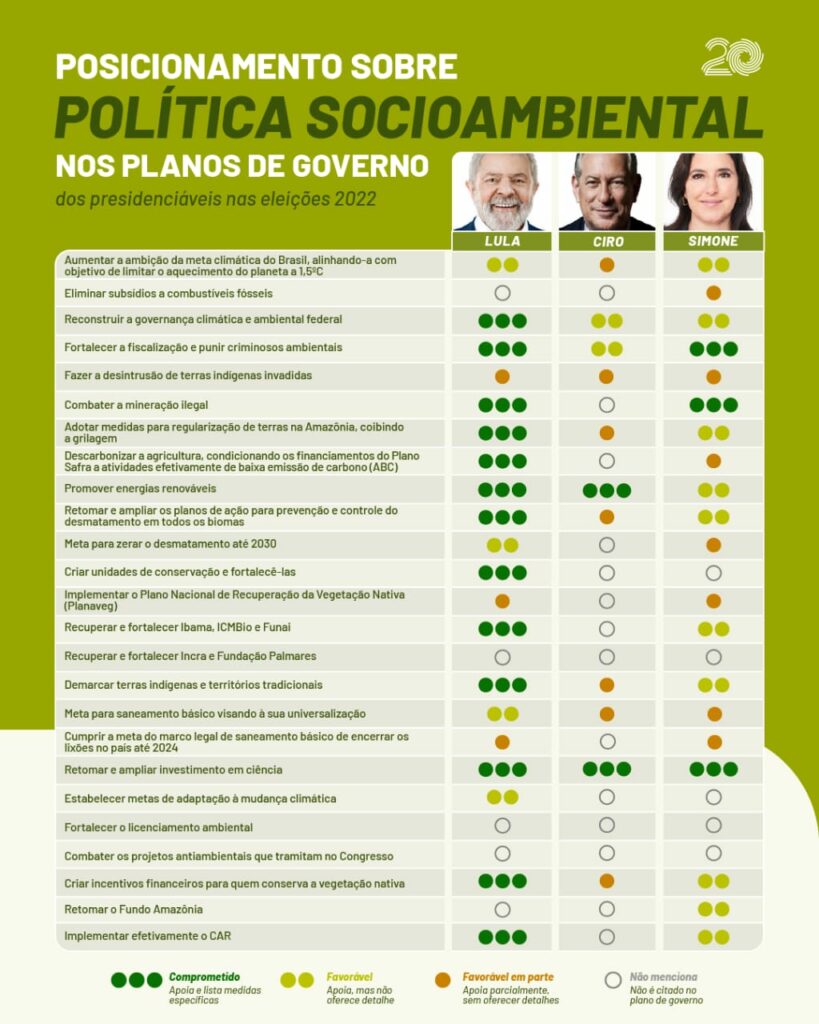 Para o levantamento, resumido na tabela abaixo, o Observatório do Clima destrinchou os planos de governo apresentados até este momento à Justiça Eleitoral. O levantamento inclui os candidatos do campo democrático com mais de 1% nas pesquisas de intenção de voto. As promessas de Jair Bolsonaro para um segundo mandato não foram consideradas no comparativo, em razão do desmonte ambiental sem precedentes no período pós-ditadura militar realizado pela atual gestão. A análise do plano entregue por Bolsonaro foi realizada separadamente pelo Fakebook.eco.