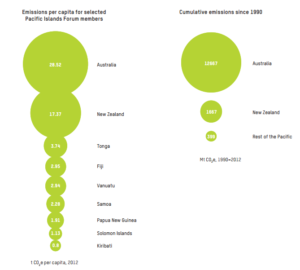 Os países mais vulneráveis aos efeitos das mudanças climáticas na região são os que menos têm responsabilidade sobre o problema. De acordo com levantamento do World Resources Institute, enquanto Austrália e Nova Zelândia responderam pela emissão de 14,3 bilhões de toneladas de CO2 equivalente de 1990 até 2012, todo o resto do Pacífico emitiu 399 milhões de toneladas no período.