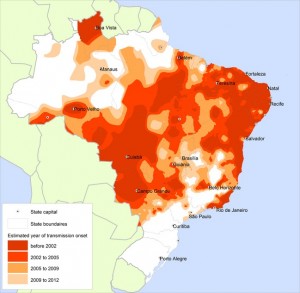 As áreas em vermelho-claro e laranja mostram o a expansão da dengue Brasil após 2001. (Fonte: “Expansão da área de transmissão da dengue no Brasil: o papel do clima e das cidades”, estudo de Christovam Barcellos e Rachel Lowe)