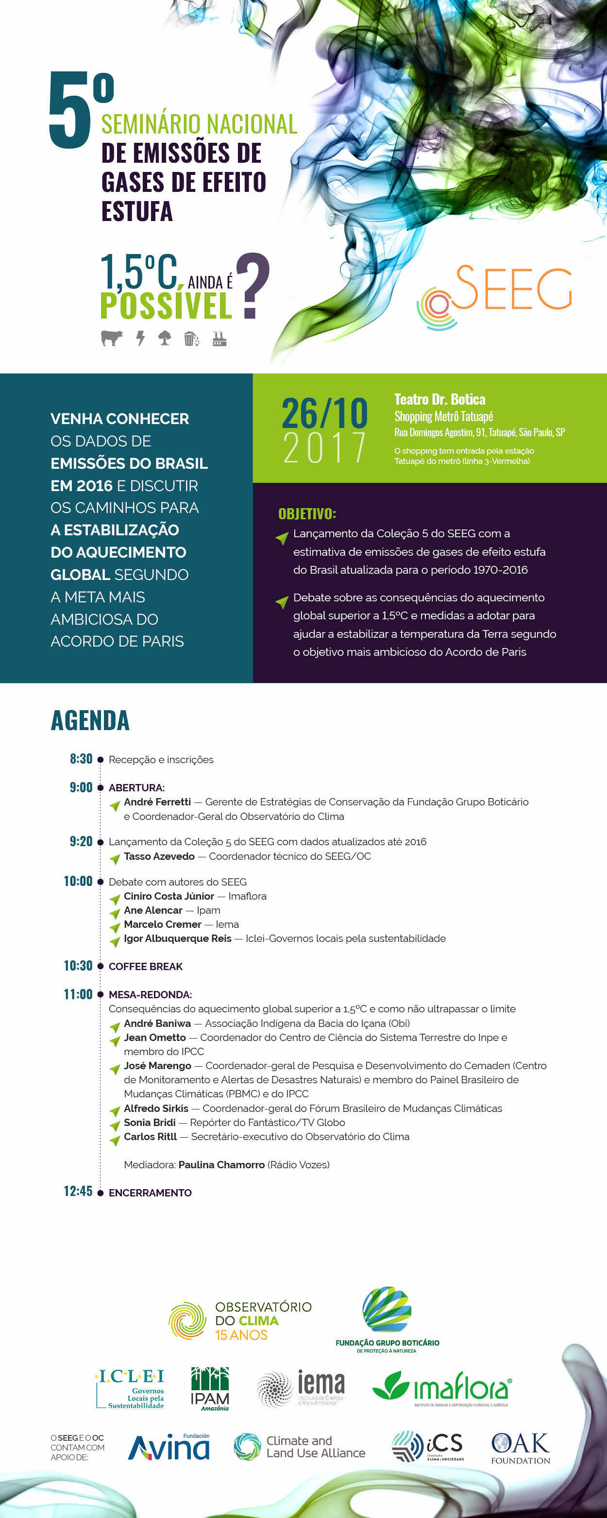 O Observatório do Clima e a Fundação Grupo Boticário convidam para o lançamento do SEEG 2017, que trará os dados de emissões de gases de efeito estufa no Brasil no ano de 2016. O evento acontece dia 26/10, em São Paulo, e será seguido de um debate sobre a meta do Acordo de Paris de estabilizar o aquecimento global em 1,5ºC. Haverá transmissão pela página do OC no Facebook.