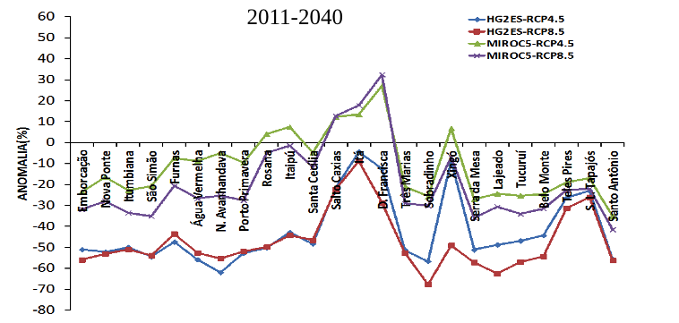 Vazões estimadas de algumas das principais hidrelétricas do país para o período 2011-2040. A linha verde mostra o melhor cenário; a vermelha, o pior.