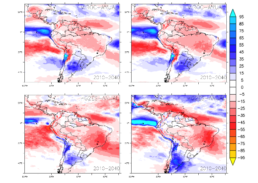 O que acontece com as chuvas no Brasil nos quatro cenários avaliados pelo 2040: o melhor cenário (mapa superior esquerdo) e o pior (inferior dirteito)