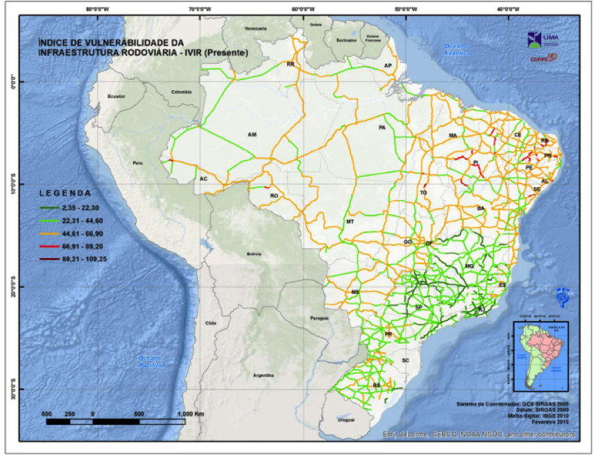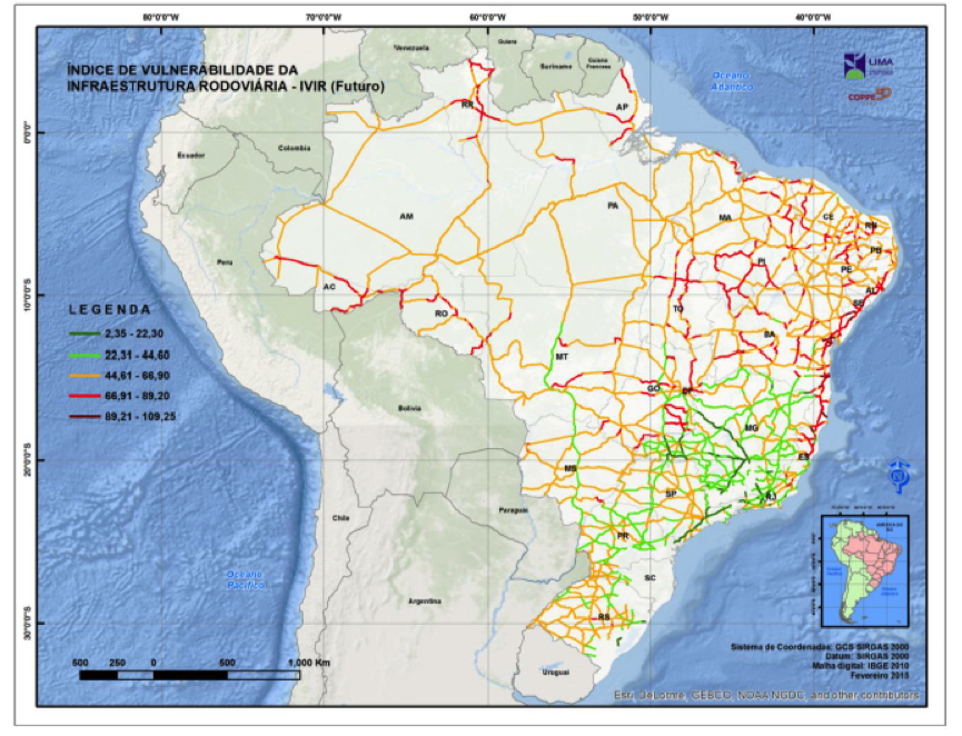 Combinando informações sobre sinalização, qualidade do asfalto e condições das rodovias, elaborou-se o Índice de Vulnerabilidade da Infraestrutura Rodoviária (IVIR). Quanto mais alto, mais vulneráveis são as rodovias. Observando os mapas, é possível comparar o número de rodovias vulneráveis hoje e em 2040.