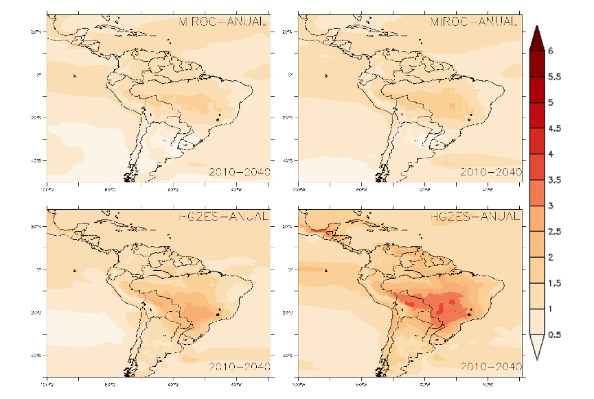 O que a modelagem revelou foi que, em todos os cenários, o Brasil de 2040 será um país mais quente e mais seco. As temperaturas médias nos meses mais quentes do ano podem subir até 3oC em relação às médias atuais no Centro-Oeste. A região Sul tende a ficar mais chuvosa, enquanto o Sudeste, o Centro-Oeste e partes do Norte e Nordeste teriam reduções nas chuvas, em especial nos meses de verão.