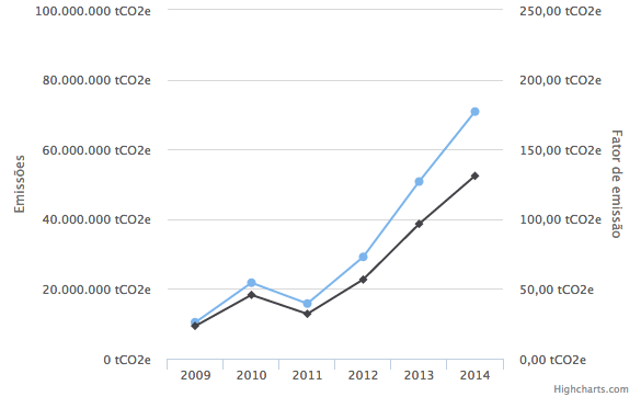 Pelo Monitor, ficamos sabendo, por exemplo, que no dia 16 de novembro deste ano, 73,32% da eletricidade gerada no Sistema Interligado Nacional (SIN)* veio de usinas hidrelétricas. Outros 3,99% vieram de usinas eólicas, enquanto 17,92%, de térmelétricas movidas à combustíveis fósseis, que são poluentes. Por conta dessa geração térmica, vemos pelo Monitor que as emissões de gases de efeito estufa pela geração de eletricidade no SIN eram de 15,8 milhões de toneladas equivalentes de CO2 em 2011 e foram para 70,8 milhões em 2014 – ou seja, mais que quadruplicaram.