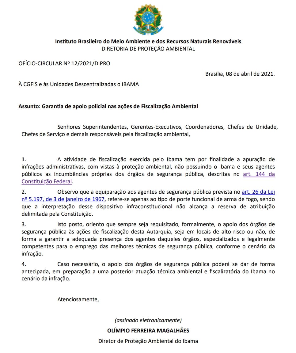 Este é, aliás, o argumento usado pelo diretor de Proteção Ambiental do Ibama, major Olímpio Ferreira Magalhães, em ofício enviado no último dia 8 às unidades do instituto para restringir o trabalho dos fiscais: “(…) oriento que sempre seja requisitado, formalmente, o apoio dos órgãos de segurança pública às ações de fiscalização desta Autarquia, seja em locais de alto risco ou não, de forma a garantir a adequada presença dos agentes daqueles órgãos, especializados e legalmente competentes para o emprego das melhores técnicas de segurança pública, conforme o cenário da infração”. Ele destaca no ofício que, embora o art. 26 da Lei nº 5.197/1967 equipare os fiscais ambientais a agentes de segurança pública, isso diz respeito apenas ao porte de arma de fogo para fiscais ambientais, necessário para o exercício da função, e não às atividades de segurança pública.