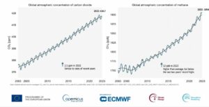 Gráfico mostra o aumento das concentrações de CO2 e metano. Fonte: relatório C3S